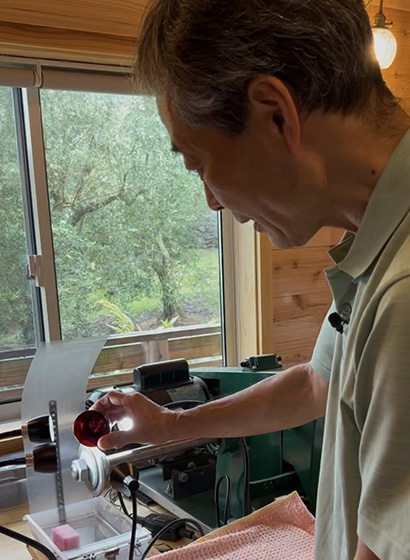 Currently, I spend half the month in Shodoshima and half the month in Tokushima, traveling back and forth as I work on faceting," says faceting artist Keiji Ishikawa. We interviewed him at his home and workshop on a hilltop in an olive grove.