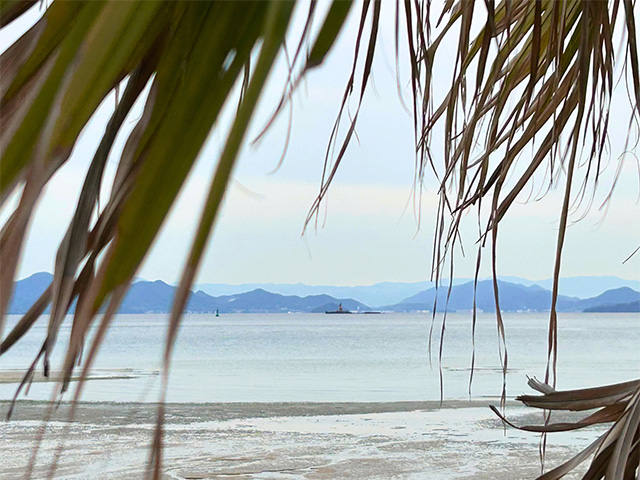 Shimarebi, we asked Ms. Saito to paint her favorite view. The location he chose is Enoura Beach, just a five-minute walk from the port. Through the gaps in the leaves of her favorite plant, the palm tree, the gentle Seto Inland Sea and the Sanuki Hiroshima rock, Sanuki Hiroshima, carry the summer breeze.